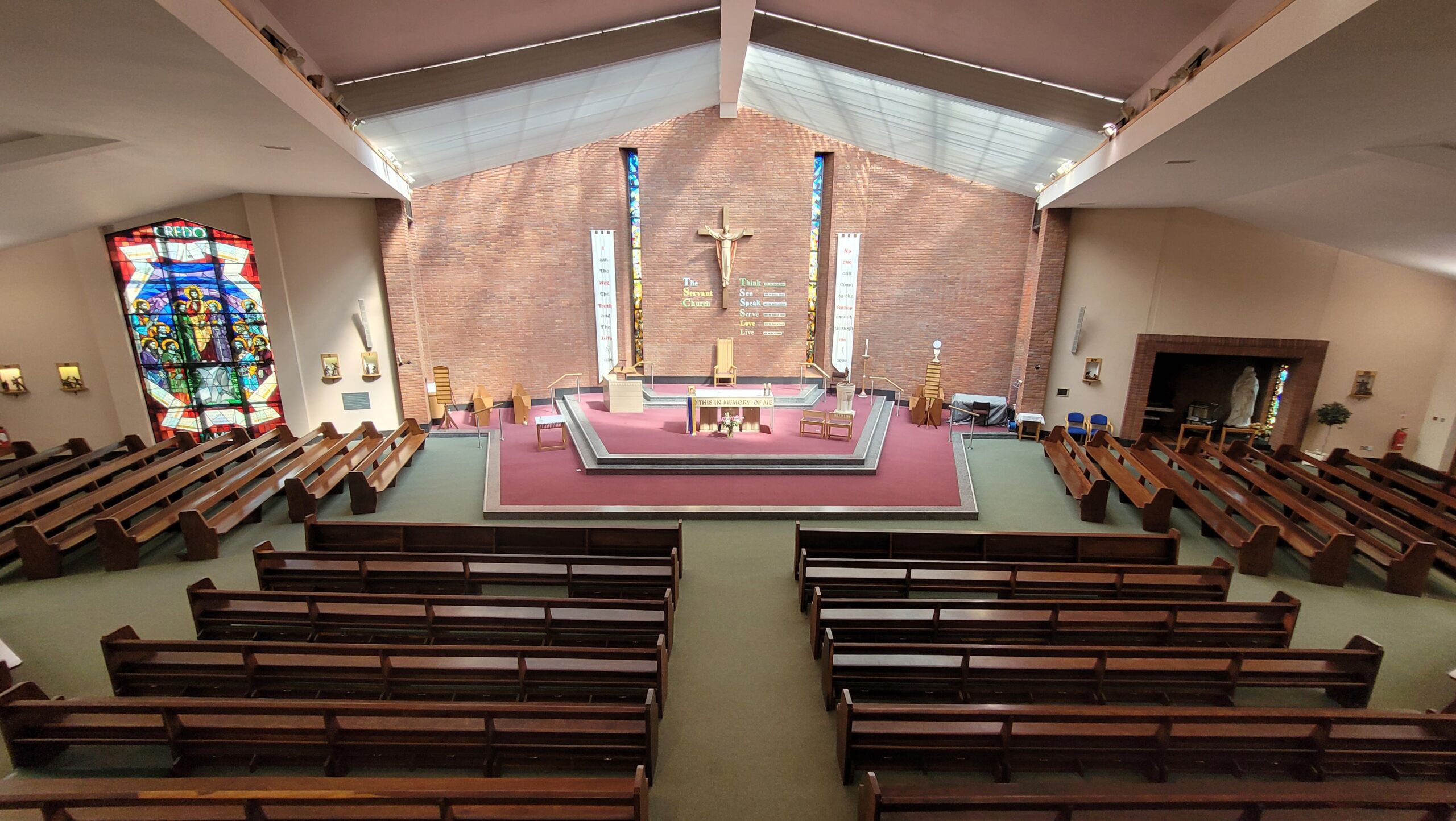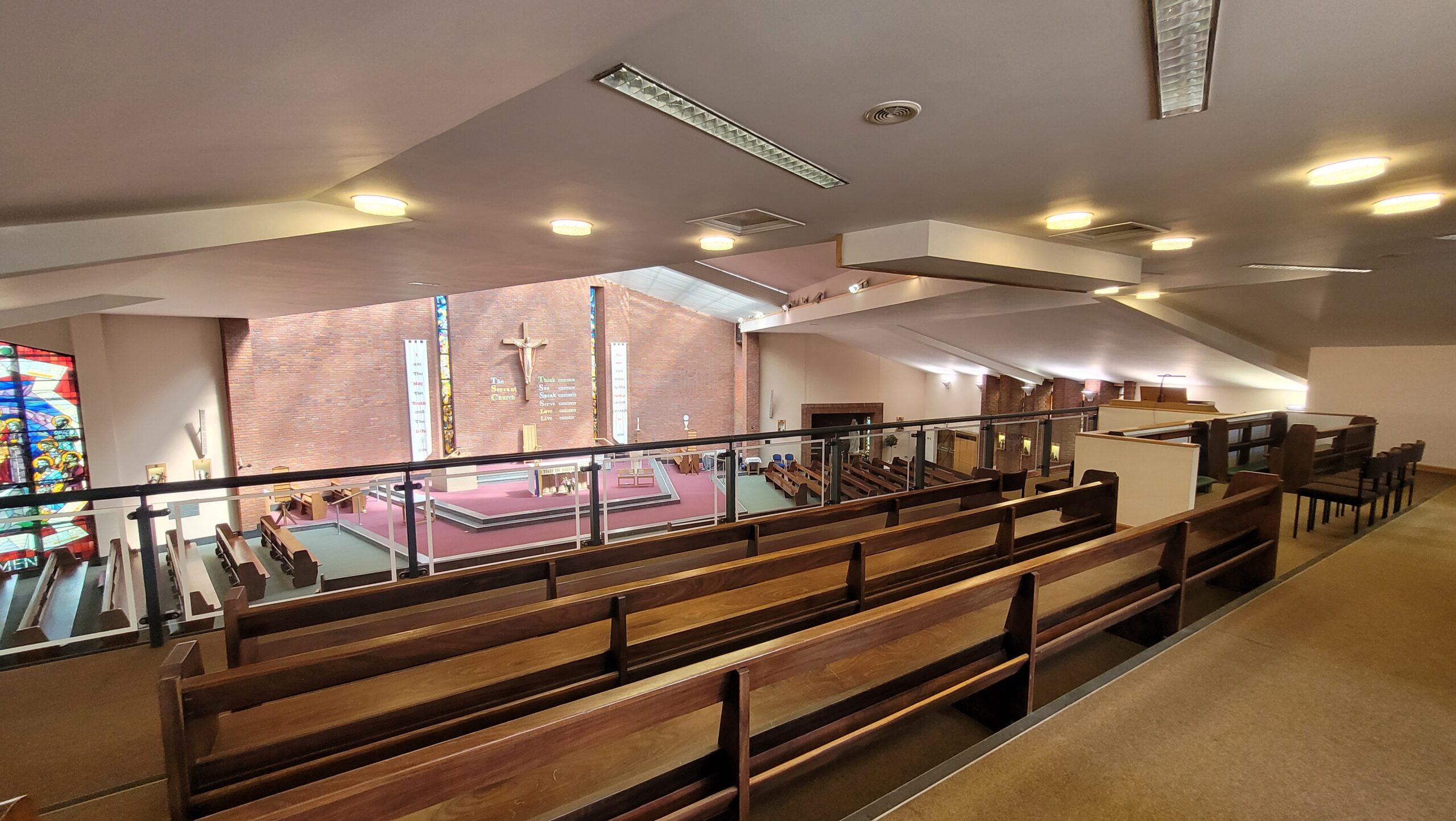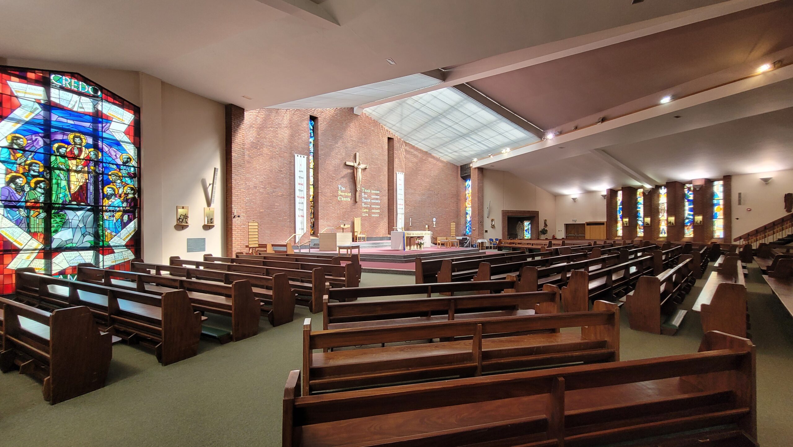 The current church retains some of the features of the older 1958 building, including pews, Stations of the cross. The Tabernacle and the large Credo window, formerly of the high altar. The figure of Christ the Mediator, once adorning the front wall of the old church has been mounted on a plinth in the current church grounds. The Presbytery built in 1930 to house a Dominican community. It has since been modernised. Adjoining the current church and presbytery is the Parish Hall, designated as the Mary Forryan Centre, after a devoted and outstanding member of the church congregation.